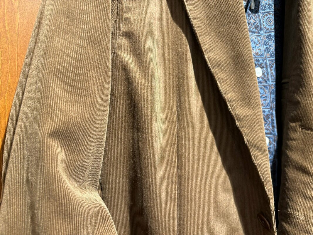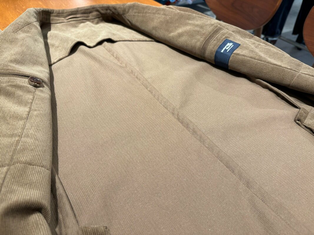 コーデュロイ素材にありがちな重さは一切なく、むしろ裏地が無い「アンコン仕立て」に近い仕様ですので、非常に軽く、着用の負担が少ないのもポイントです。