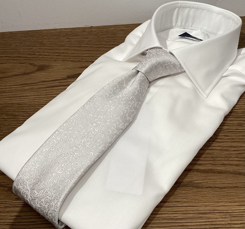 シャツは写真のような白無地のワイドカラー(スプレッド)かセミワイドカラー、レギュラーカラーが基本です。
