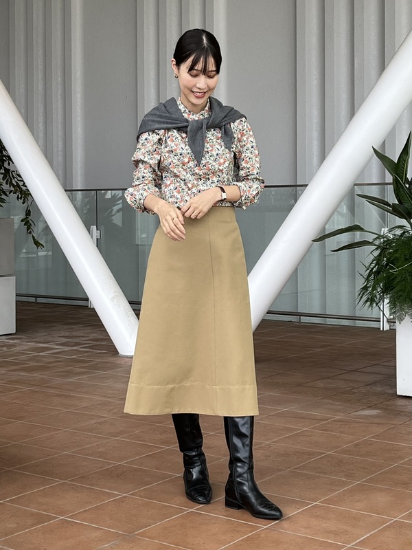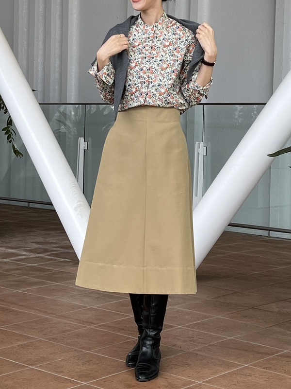 シャツの地の色がクリーム色なので、ベージュとの合わせもおすすめです。