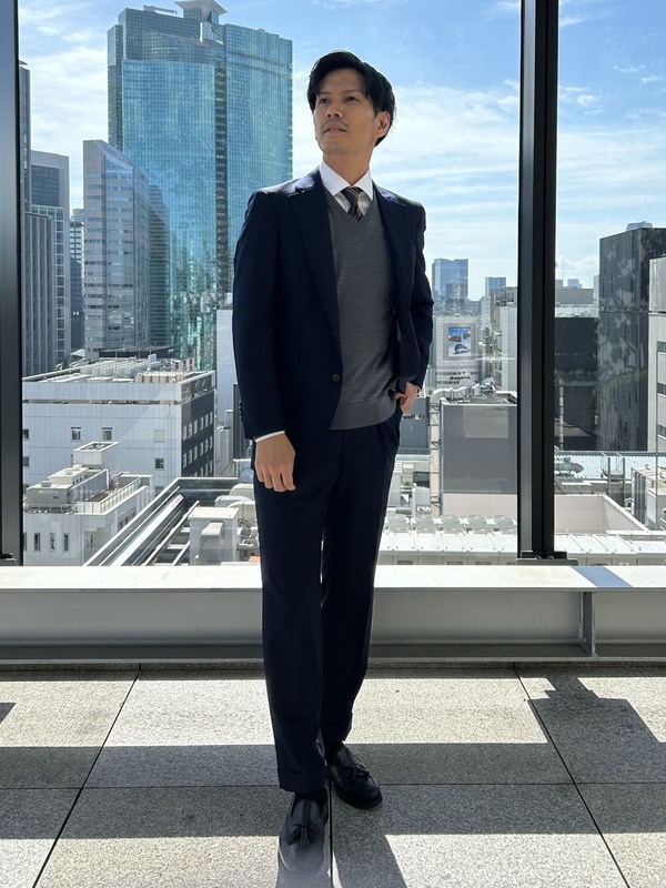 Vネックのすっきりとした首元のため、タイドアップがおすすめです。
