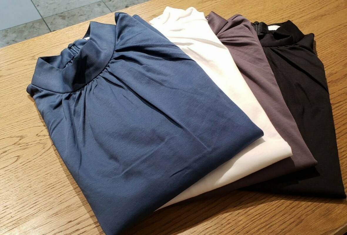 レディースでは高級コットンを使用したスタンドギャザーブラウス。