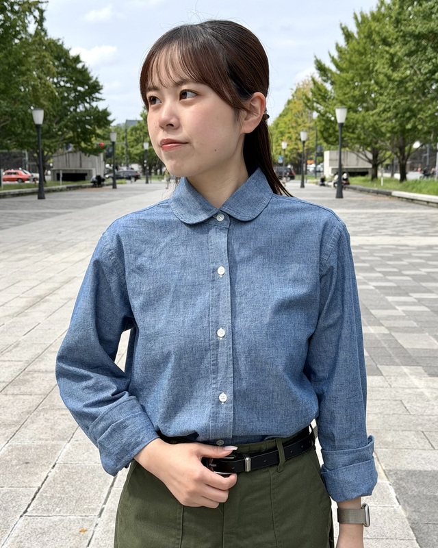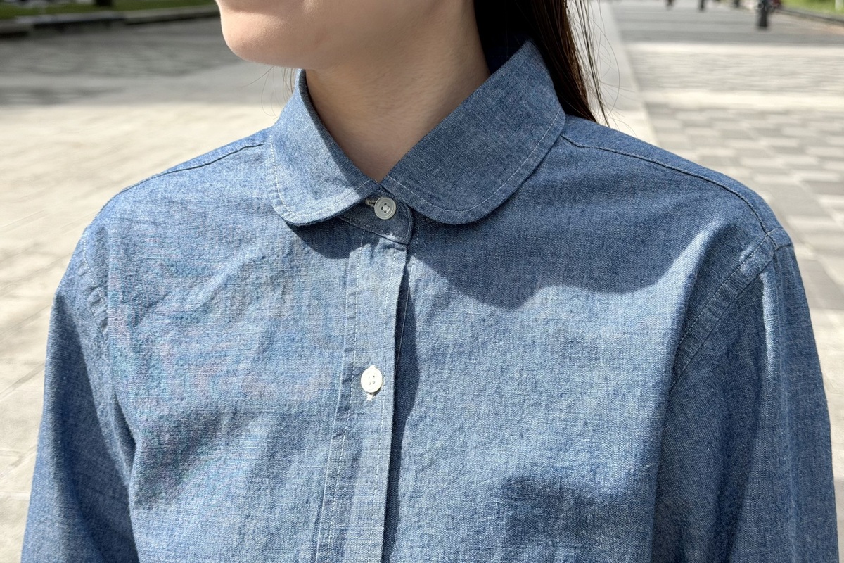 1枚持っておくと間違いなし。ラウンドカラーのシャンブレーシャツをご紹介いたします。