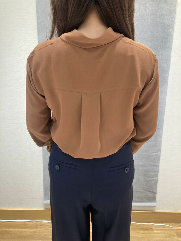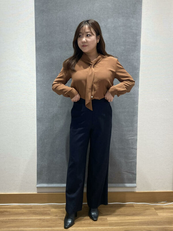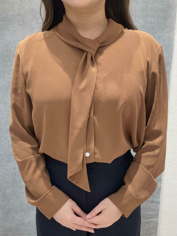 ブラウン系のボウタイブラウス。