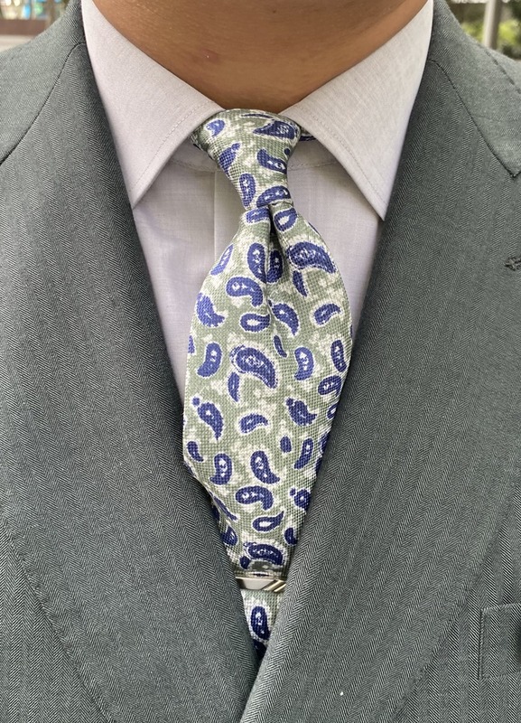 落ち着いたトーンのグリーンをベースに、ブルーのペイズリーが映える一本。