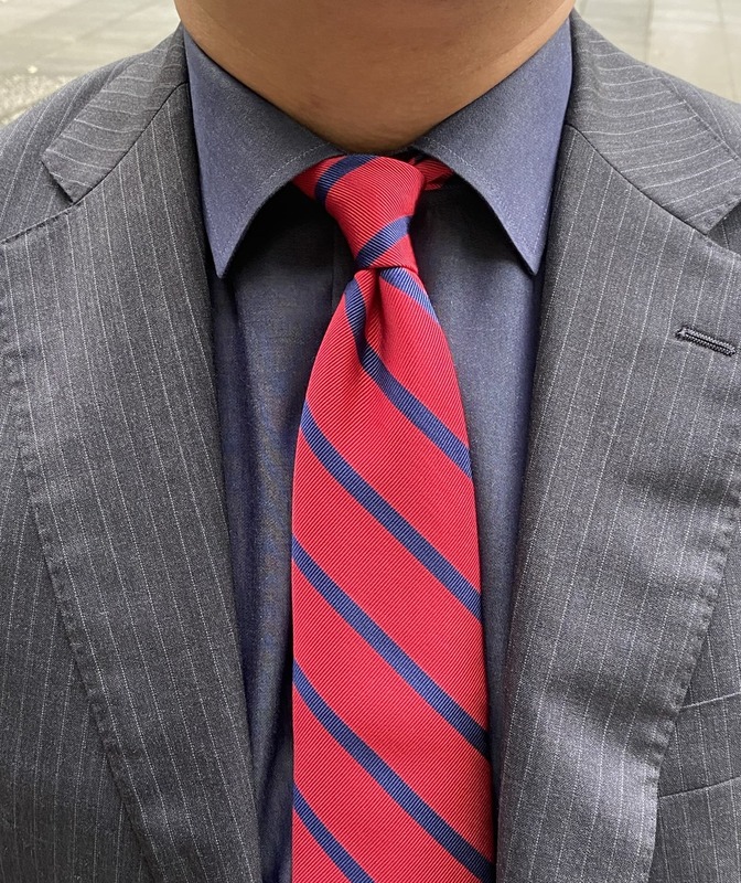 鮮やかな赤にネイビーのストライプは、トラッドスタイルの王道アイテム◎
