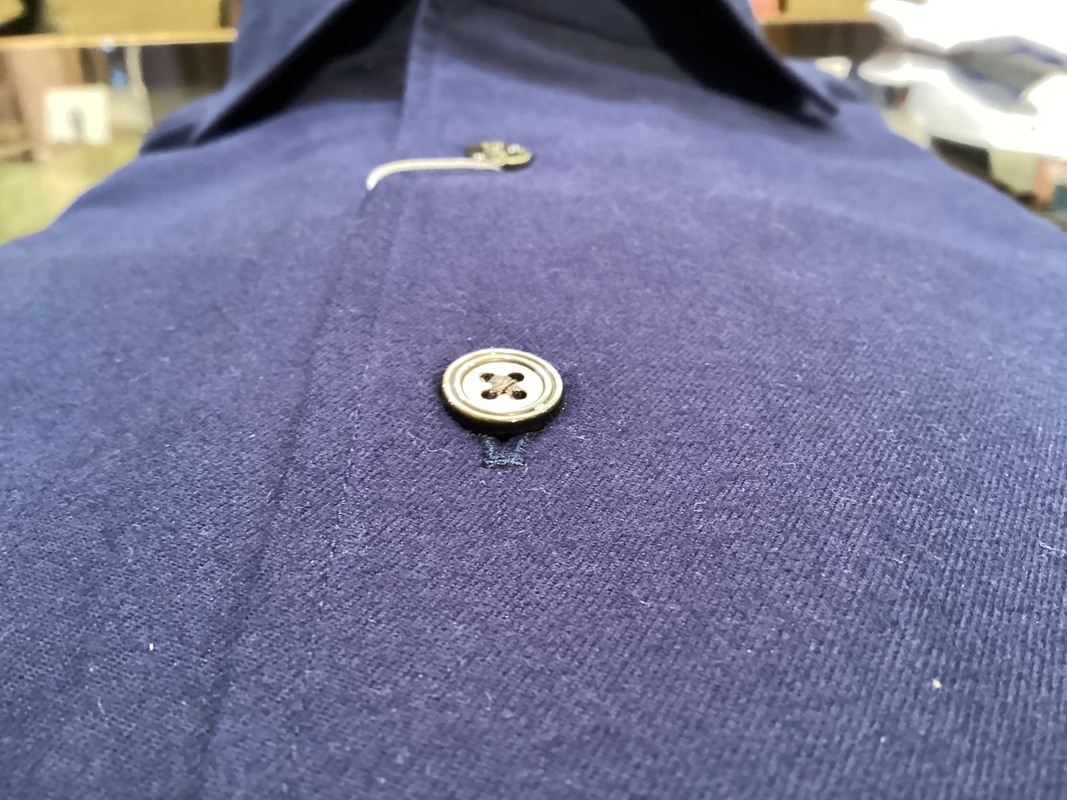 それによりノータイの時にボタンを開けた襟のロールが様になる襟が特徴。
