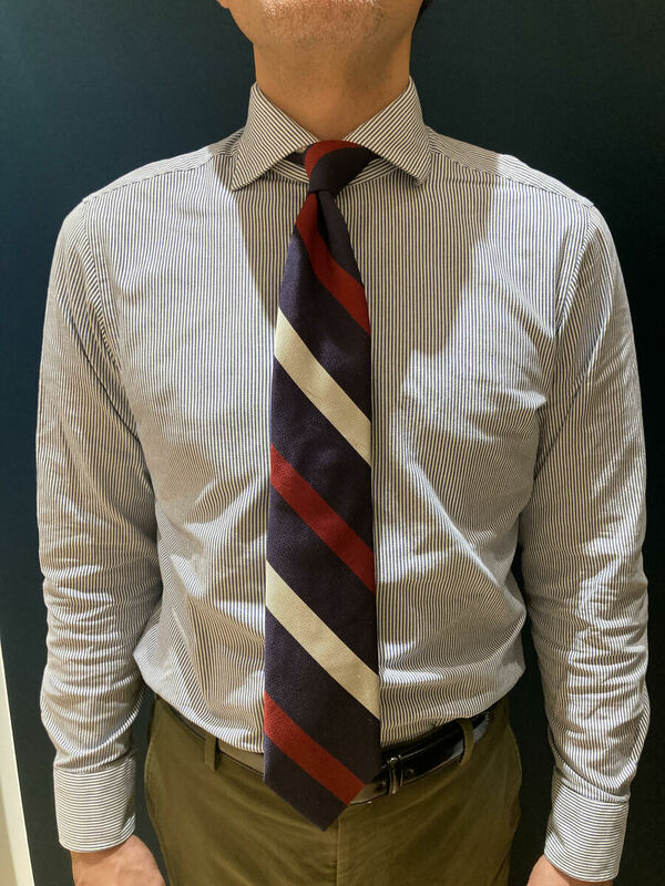 ブルー系のヘアラインストライプに合わせると、こなれた印象に仕上がります。