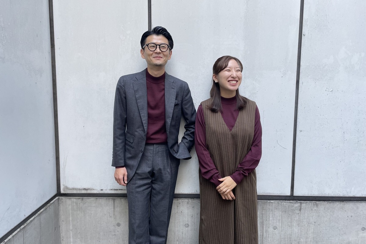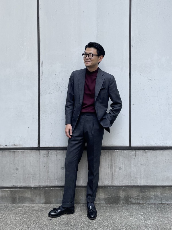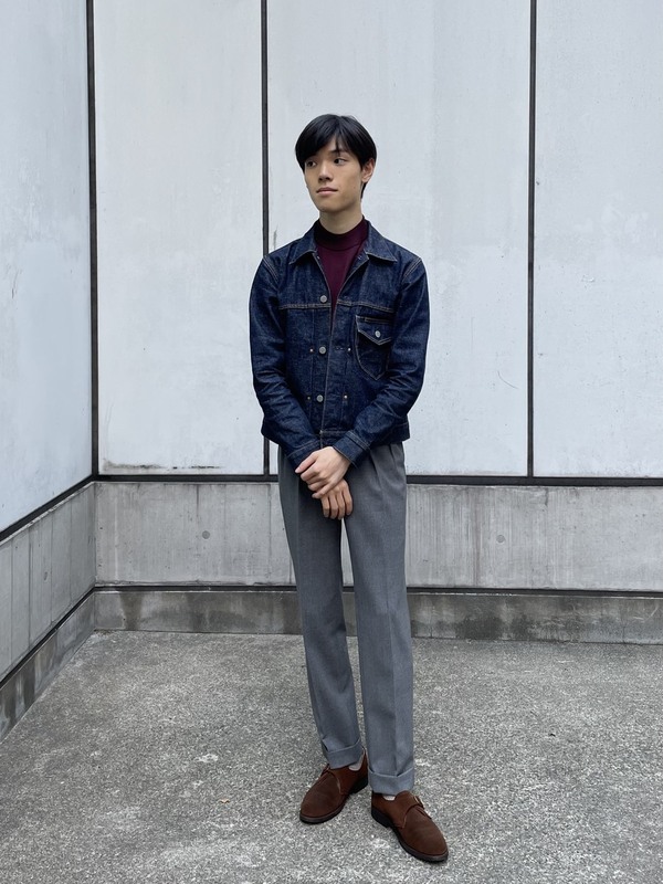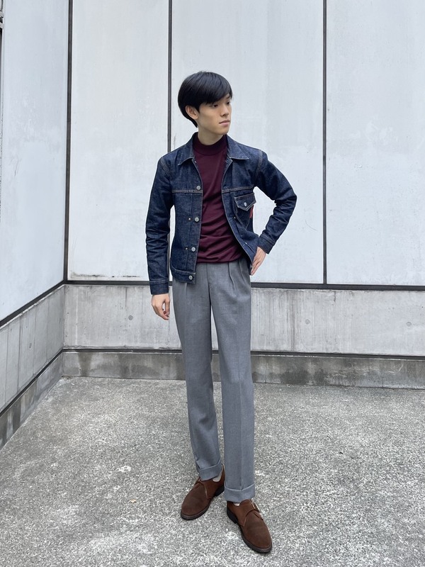 新作モックネックセーターの渋谷店限定色(ボルドー)を着用したコーディネートをご紹介いたします。