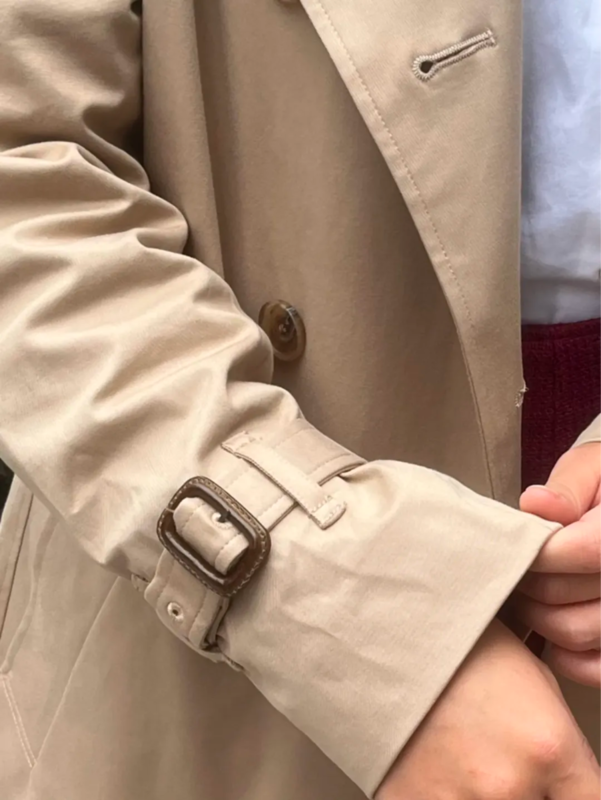 シンプルながら形が上品なこのトレンチコートは、共布のベルトを後ろで結び、前を開けて着るとカジュアルダウンしたスタイルも楽しめます。