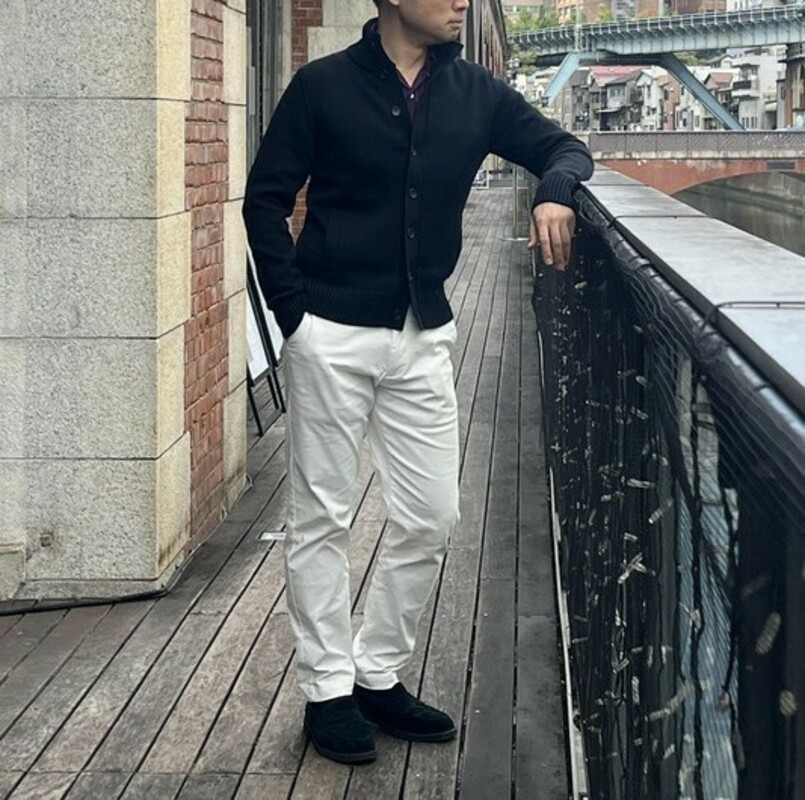 定番色の黒のスタンドカラーカーディガンを使ってコーディネートを組んでみました。