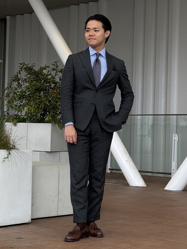 サックスブルーのシャツと合わせ、クラシカルなコーディネートを組んでみました。