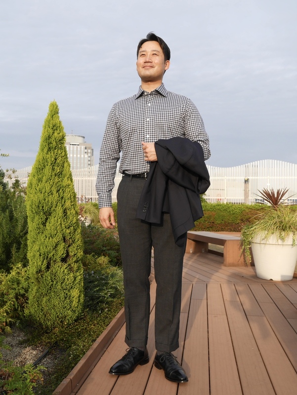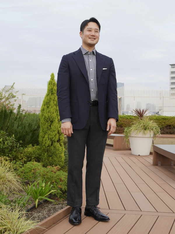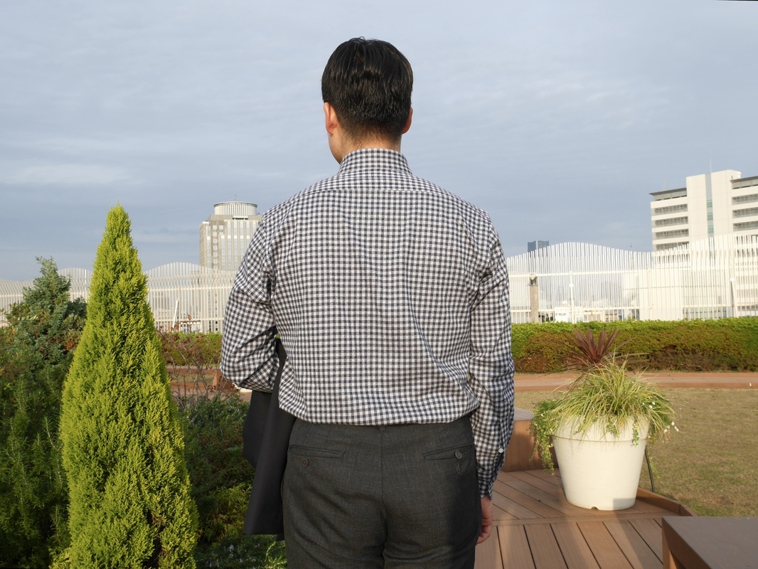 チェックのマス目が大きいため、優しく柔らかい印象でご着用いただけます。