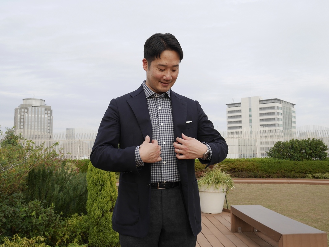 スタッフはビジネスカジュアルにジャケパンスタイルで着用しました。