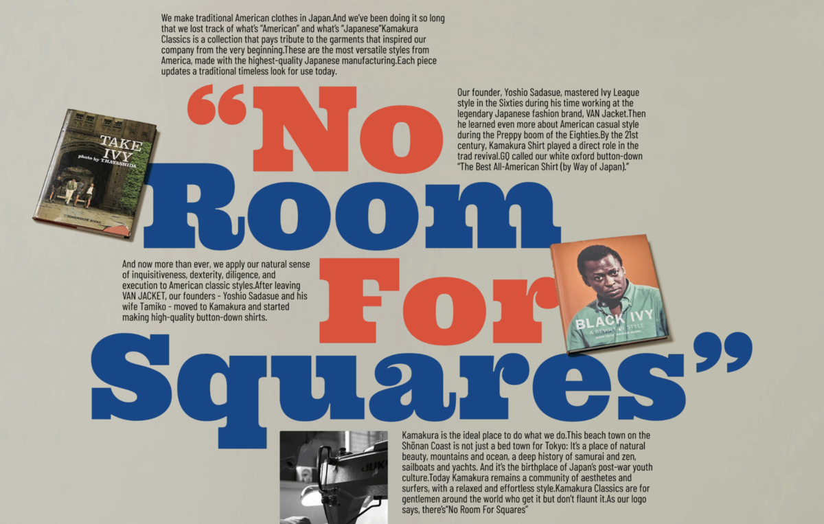 「KAMAKURA CLASSICS(鎌倉クラシックス)」は、いわゆる「アイビー・ルック(Ivy Look)」を起点に、米国東海岸の大学スタイル、1950〜60年代のアメリカントラディショナル/“AMETORA”(=アメリカン・トラディショナル)文化を日本の熟練技術で再現したコレクションです。
