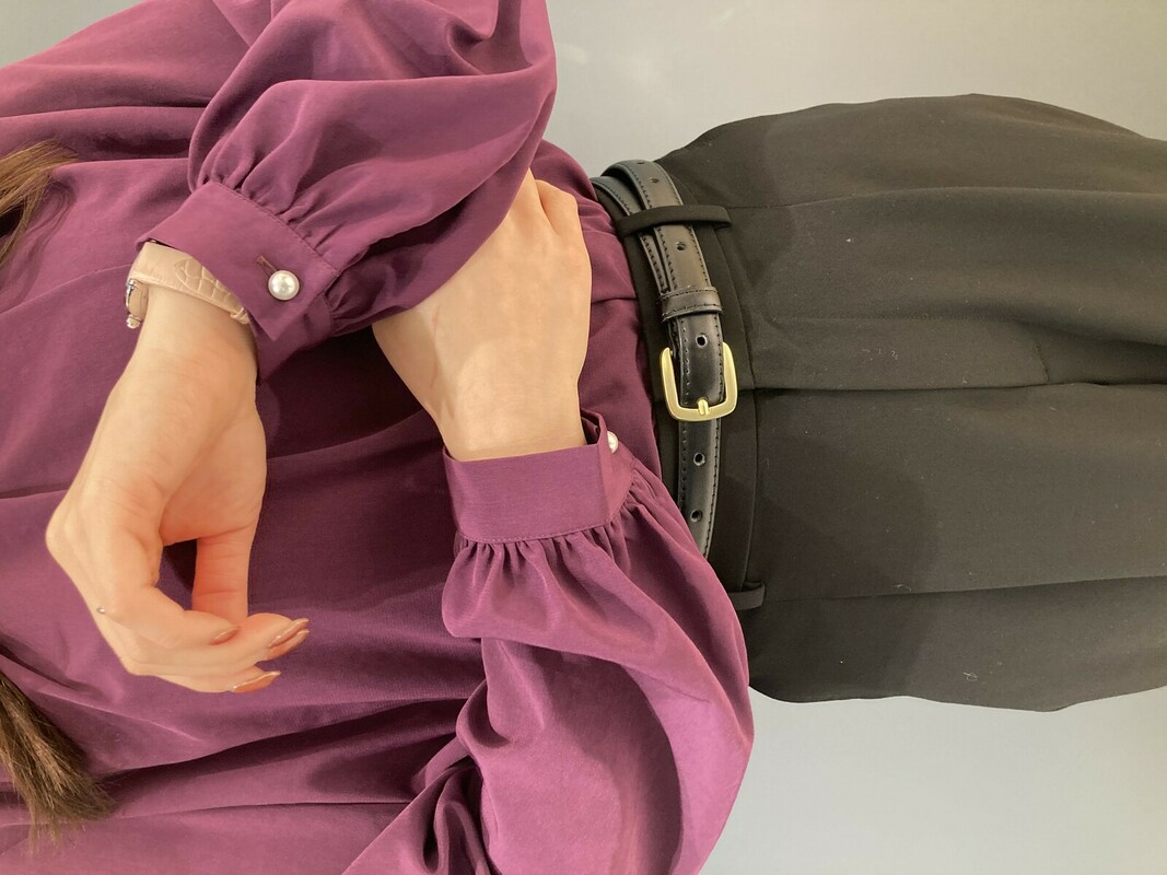 パールボタンがラグジュアリーな雰囲気を演出する、アシンメトリーブラウスをご紹介いたします。