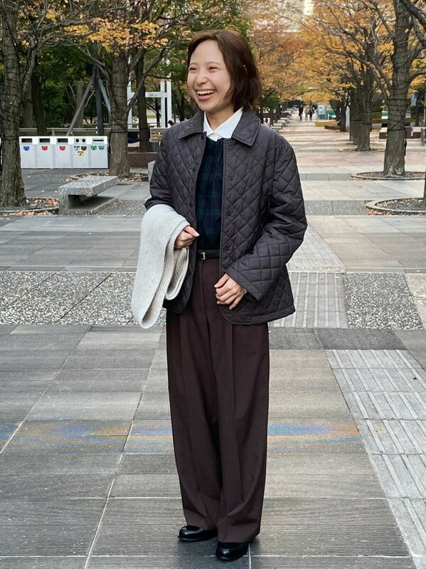軽やかなキルティングショートコートっを羽織った、