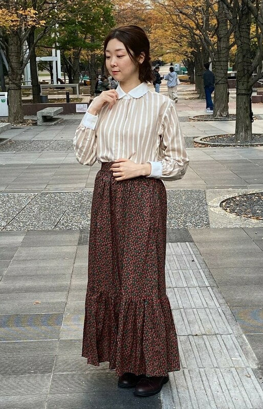 スカートのチューリップ柄は、黒ベースなので柄物同士でうるさくならず、