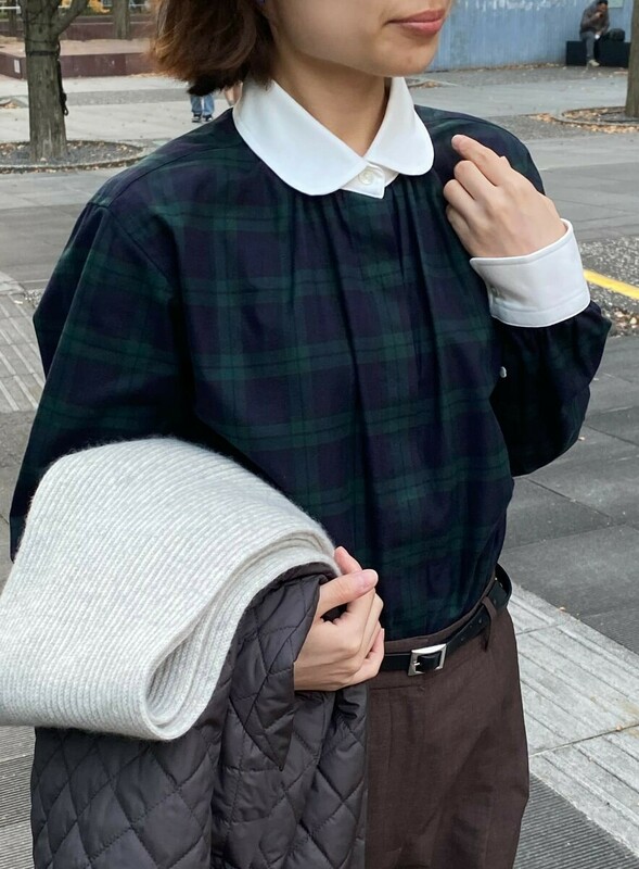 深みのあるブラックウォッチ柄(チェック)に、白の襟とカフスを組み合わせた