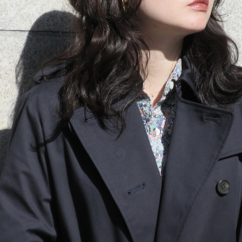 ネイビーのトレンチコートとリバティシャツのご紹介です。 ネイビーのコートでシックなカッコよさに、リバティシャツで可愛さも足して冬のお出かけを楽しみませんか?