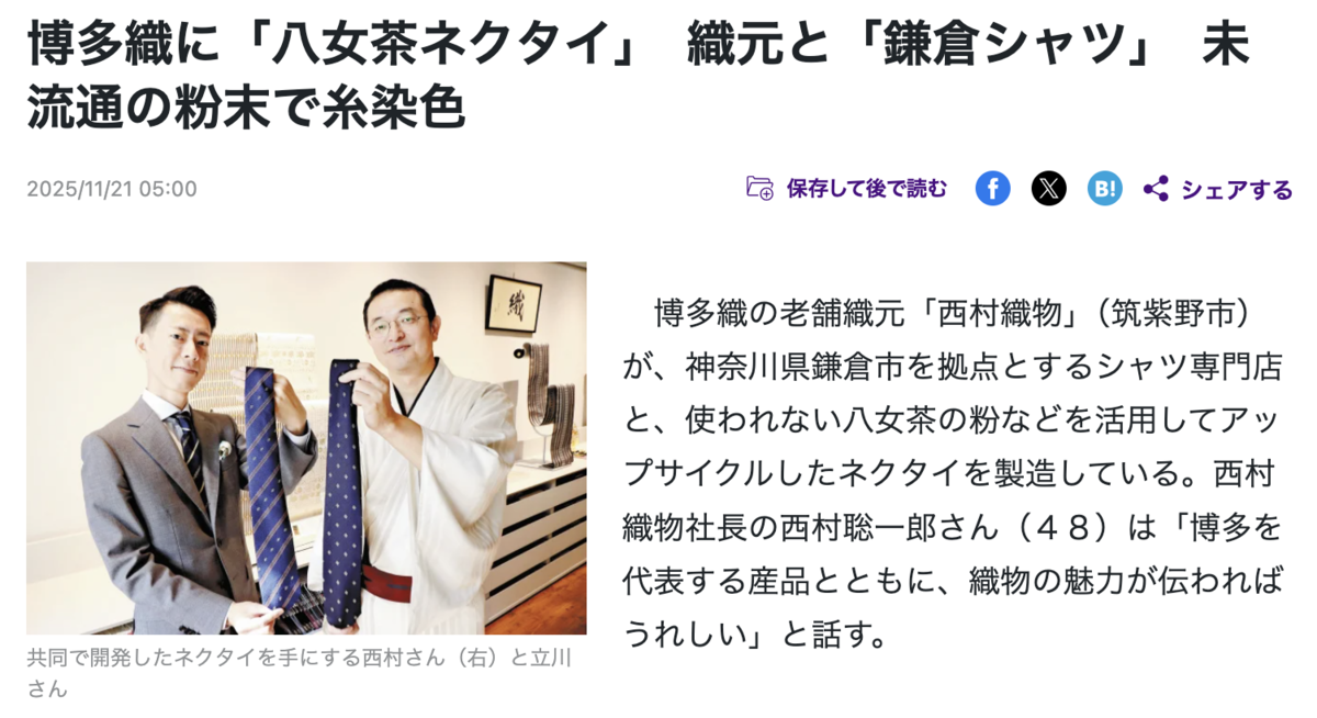 「読売新聞オンライン」にて使われない八女茶の粉などを活用してアップサイクルしたネクタイについての記事が掲載されました。