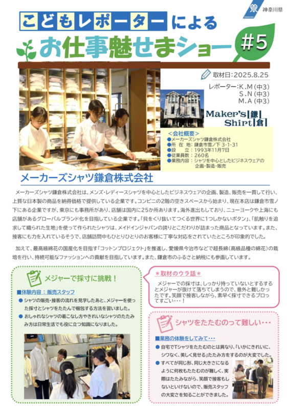 神奈川県「子ども・若者みらい提案実現プロジェクト」で優秀賞を受賞した企画「お仕事魅せまショー」の中学生レポーターの皆さんが取材に来てくださいました。