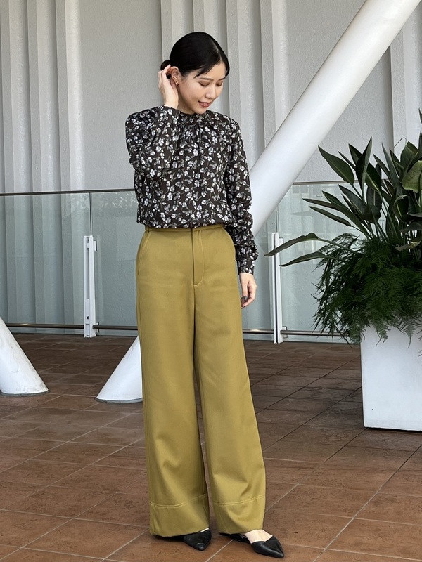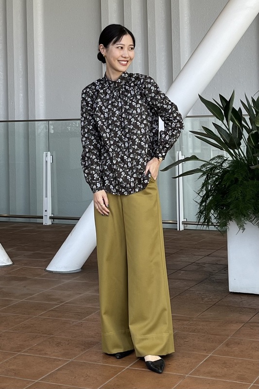 ブラウスが上品かつ落ち着いた印象なので、鮮やかな色味のボトムスと合わせてもバランスの取れたコーディネートになります。