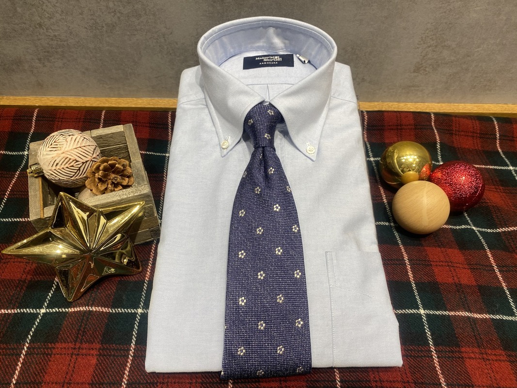 シャツは王道にブルーのオックスフォードシャツと合わせてみました。