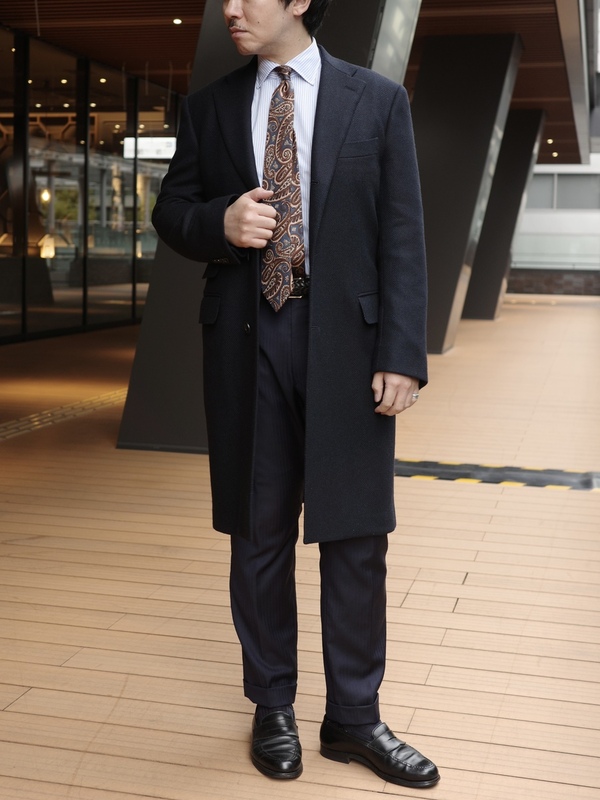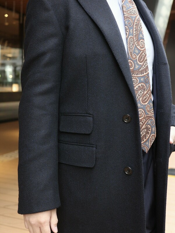 伝統的なチェスターコートの条件を満たす、膝下までの長さの着丈。