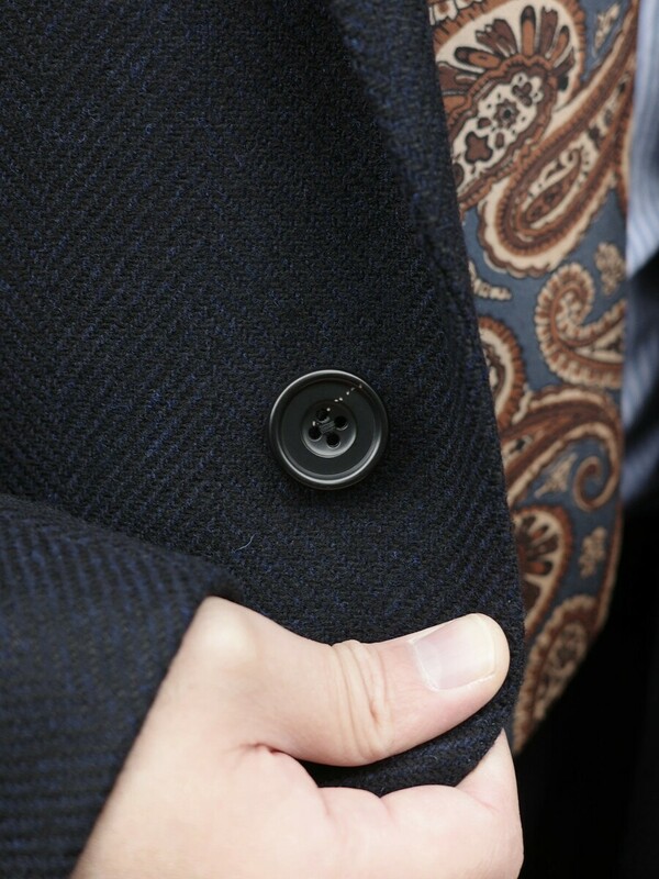 ボタンは高級感のある水牛(ホーン)ボタンを贅沢にフロント3つ、袖口は4つ