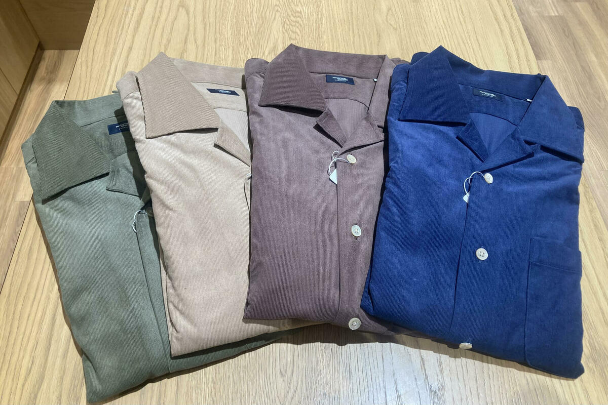 コーデュロイ生地のキャンプカラーシャツをご紹介いたします。