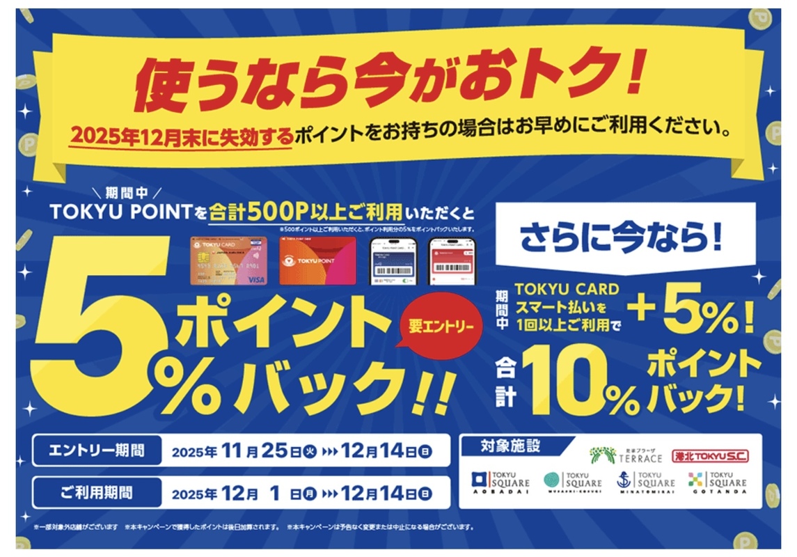 期間中、対象施設でTOKYU POINTを合計500ポイント以上ご利用いただくと、ご利用ポイントの5%をポイントバックいたします。