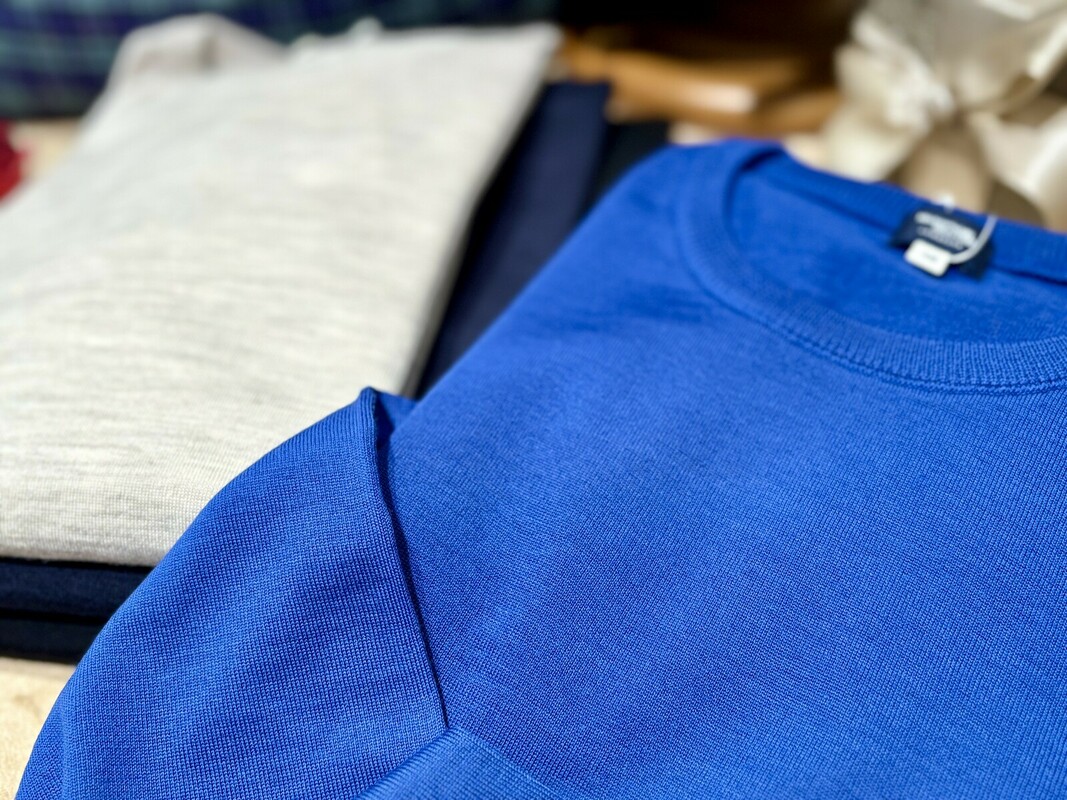 今年のおすすめはクルーネックのグリーン!自分でも着たくなるほどきれいな色です。