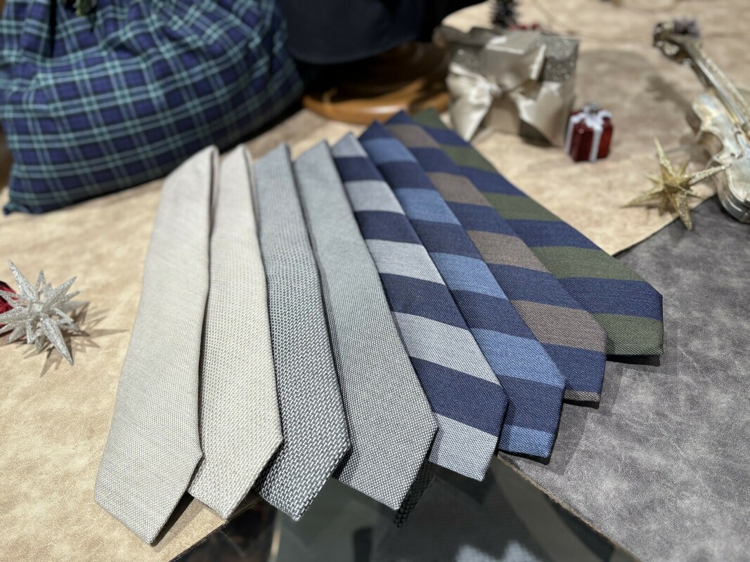 この時期になるとウール混の温かみのある生地デザインがネクタイ台に並びます。ホリデーシーズンを前に忙しくなるこの時期、毎日のお仕事も季節感のあるVゾーンで楽しく過ごせそうですね♪
