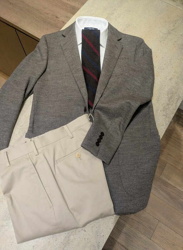 冬といえばのフランネル生地を用いたボタンダウンシャツに起毛感のあるジャケットを合わせ、温かさを優先しつつもビジネスの場に相応しい落ち着いた色味で纏めました。