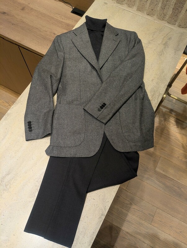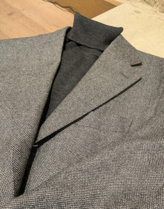 老舗生地メーカーCANONICO製の上質なウールでできたジャケットに、メリノウールを使用した薄手のタートルネックを合わせ、シックな印象に仕上げました。