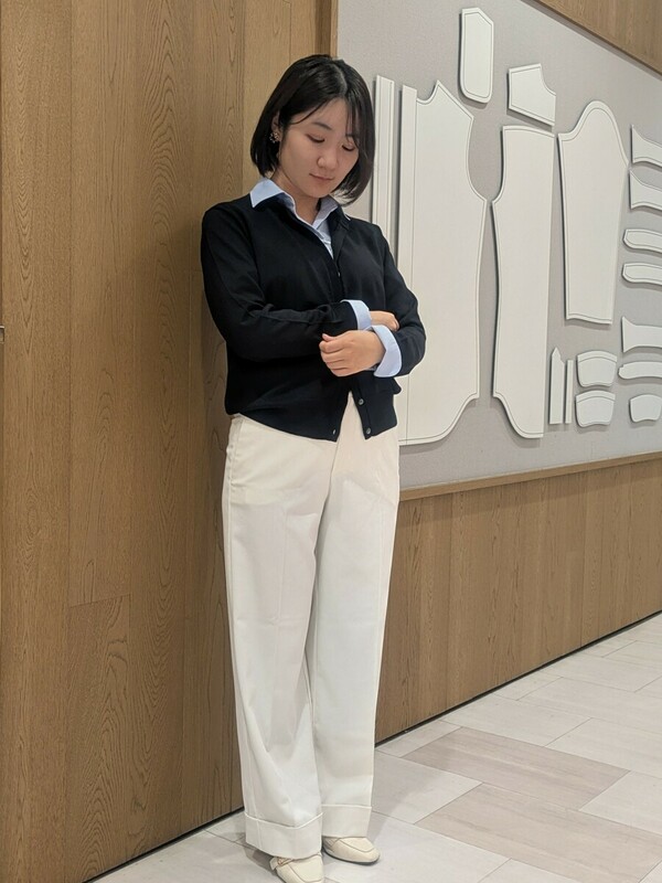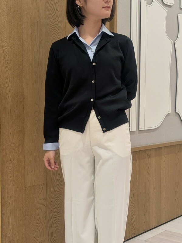 鎌倉シャツといえばのイージーケアシャツに、薄手で上品な印象を与える14ゲージニットカーディガン、オフィスカジュアルでは定番のパンツを合わせました。