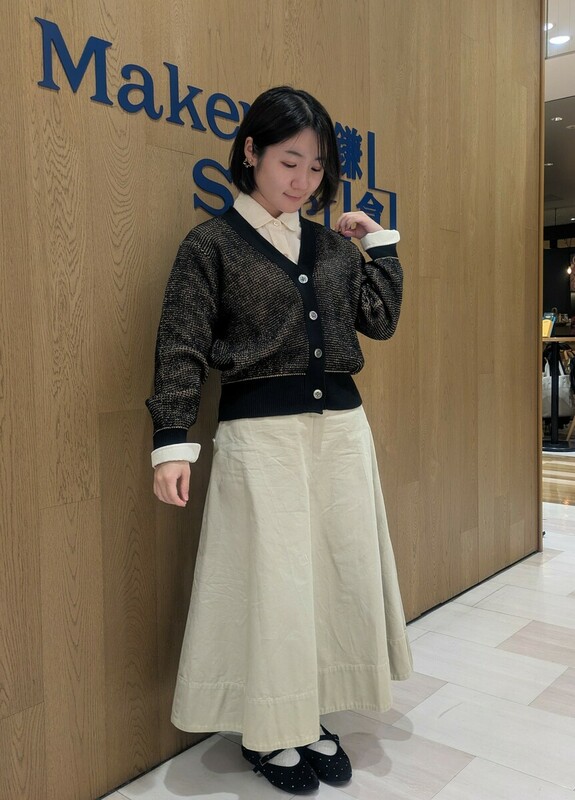 寒い冬に着たくなるコーデュロイ生地を使用した丸襟シャツにざっくりしたワッフルカーディガンを合わせ、温かみのあるコーディネートに仕上げました。