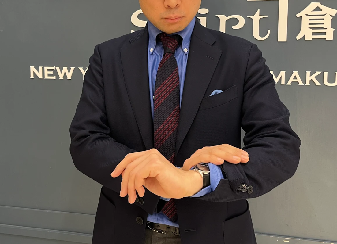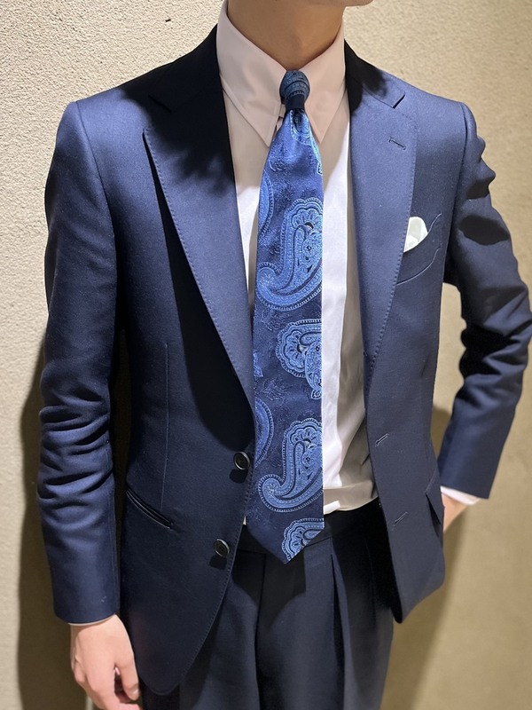 今回はびっくりするくらいビッグなペイズリー柄のネクタイをチョイスしてみました。柄の主張は強いですが、色味は使いやすいブルー系なのでコーディネートもしやすいと思います!