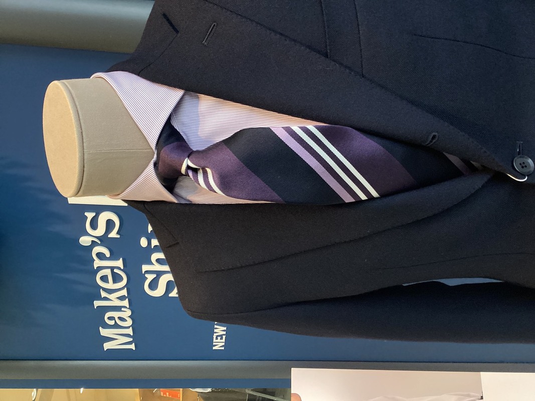 ②ワントーンでエレガントに!パープルシャツ×レジメンタルネクタイ
