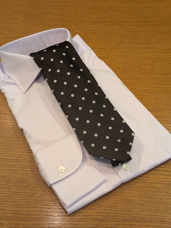 白やブルーはお持ちの方が多いですが、それ以外の色をチャレンジするときにはこちらのパープルがオススメ。濃すぎず・淡すぎず程よい色味。スーツはグレー、ネイビーどちらのスーツにも合わせやすい生地です。ネクタイはブラウンがオススメ。