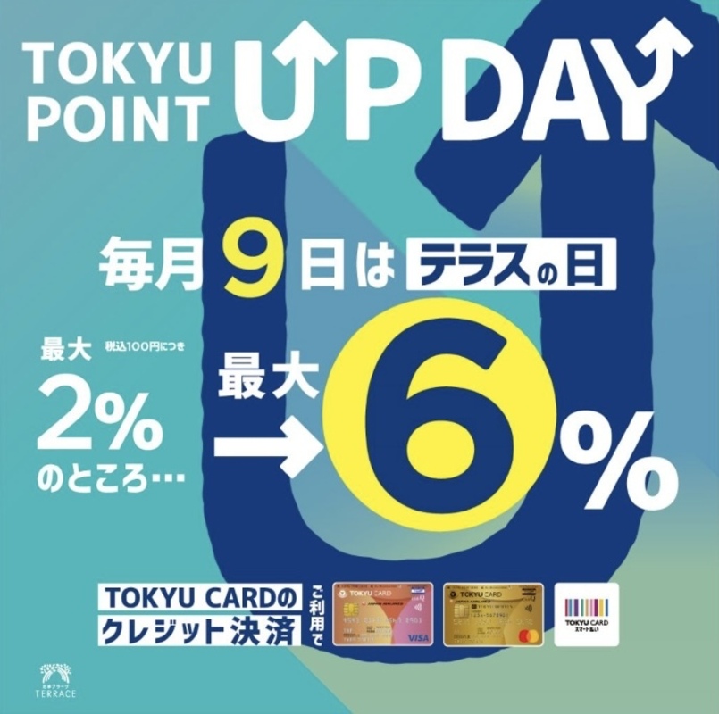 TOKYUカードをお持ちの方は今のうちに是非スマート払いの設定をお願いいたします。わからない方は館内のTOKYUカードカウンターでも承ることが出来ます。1月9日はテラスの日のため、キャッシュバックもされて、ポイントも貯まるとてつもなくお得な日でございます!