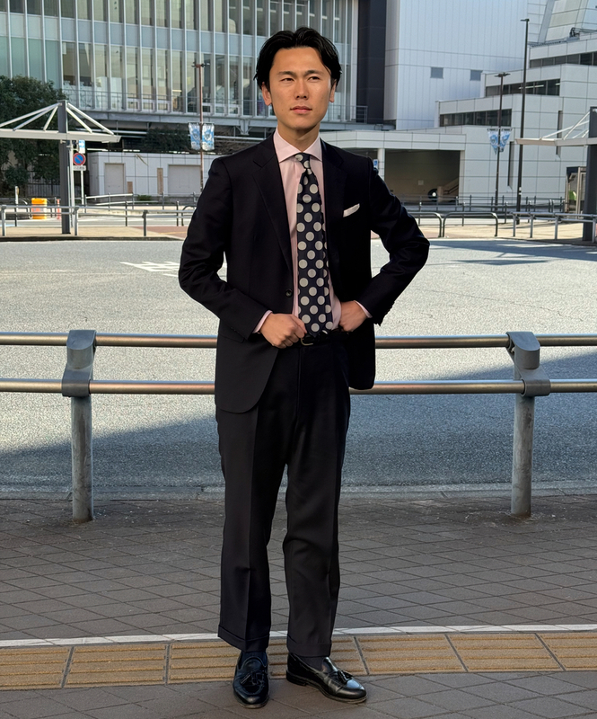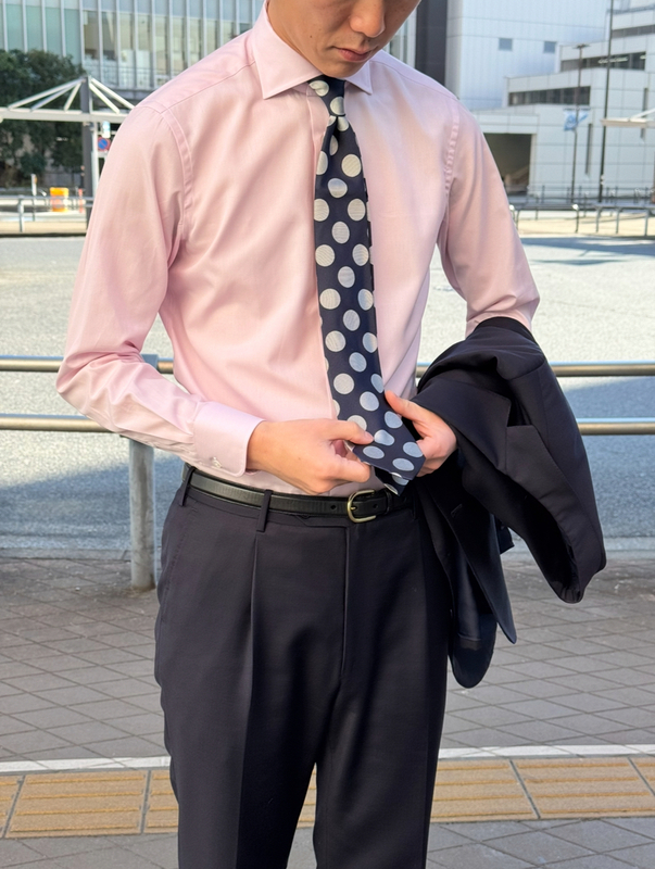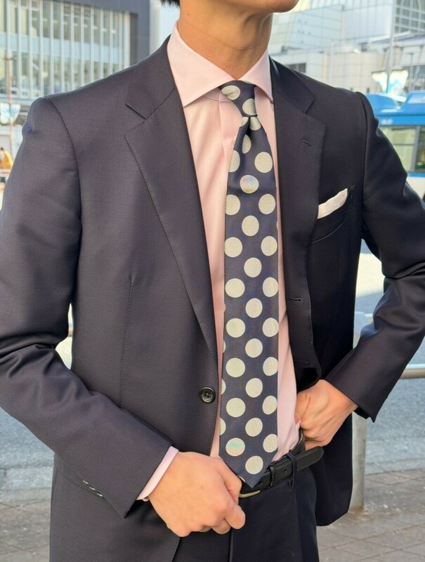 無地のアイテムが多いので、大きめな水玉ドット柄ネクタイと合わせることによって