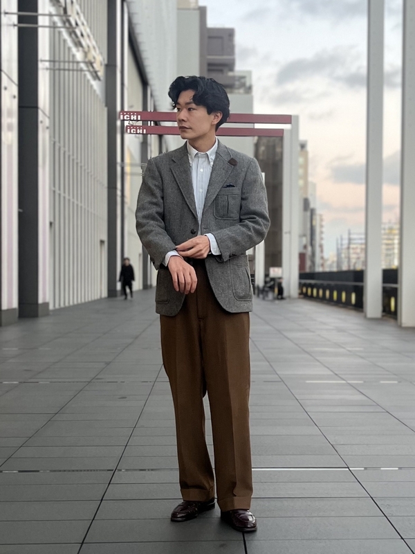 続いては、グリーンのキャンディストライプをジャケパンスタイルに合わせてみました。ツイードとの相性も良く、程よいカジュアル感と上品さを演出できます。