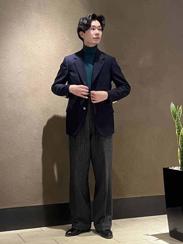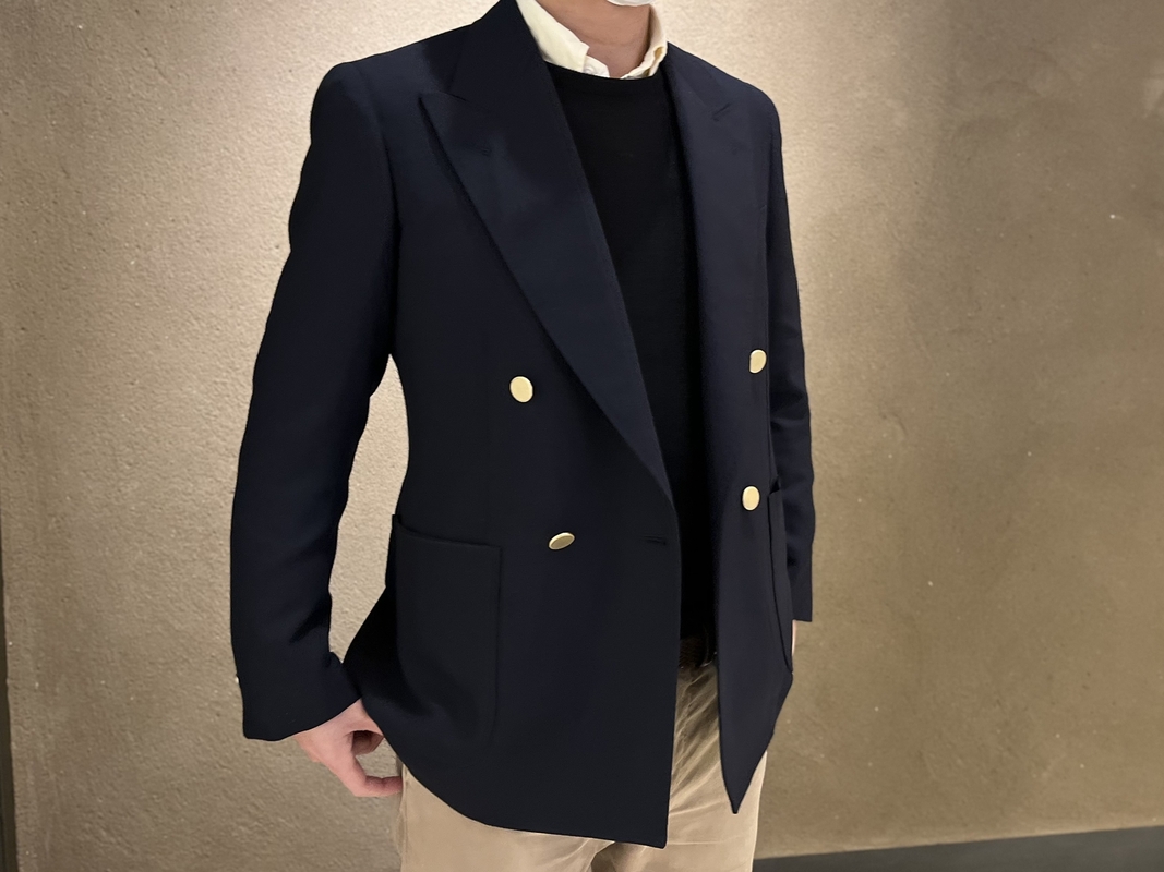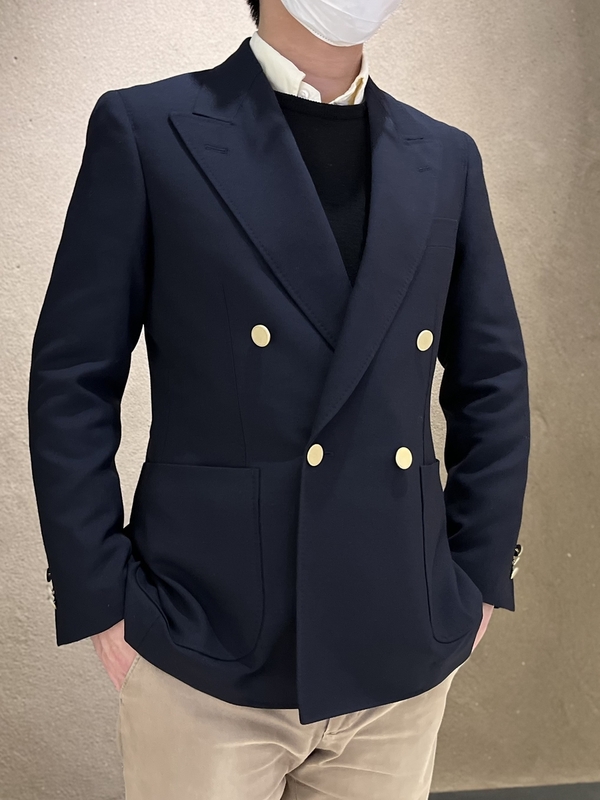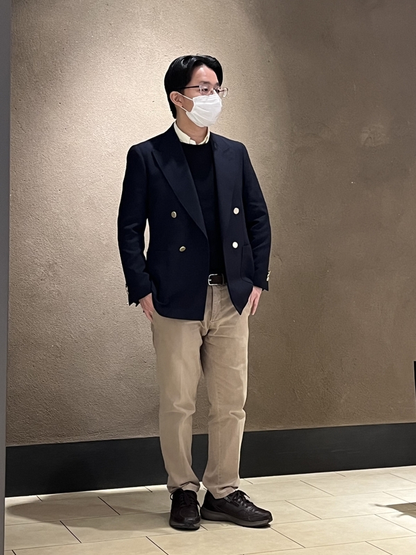 ダブルのジャケットは、チノパンに合わせてカジュアルな装いを意識してみました。