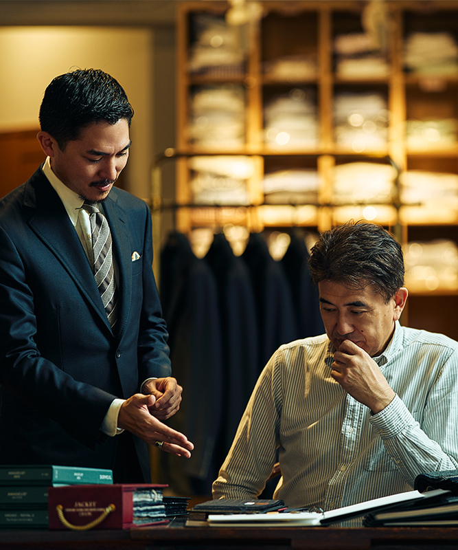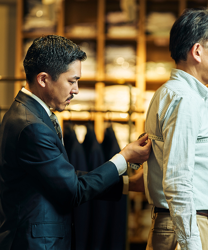 鎌倉シャツのオーダースーツは、熟練のフィッターが体型に合わせて採寸し、あなたにぴったりの一着をお仕立てします。