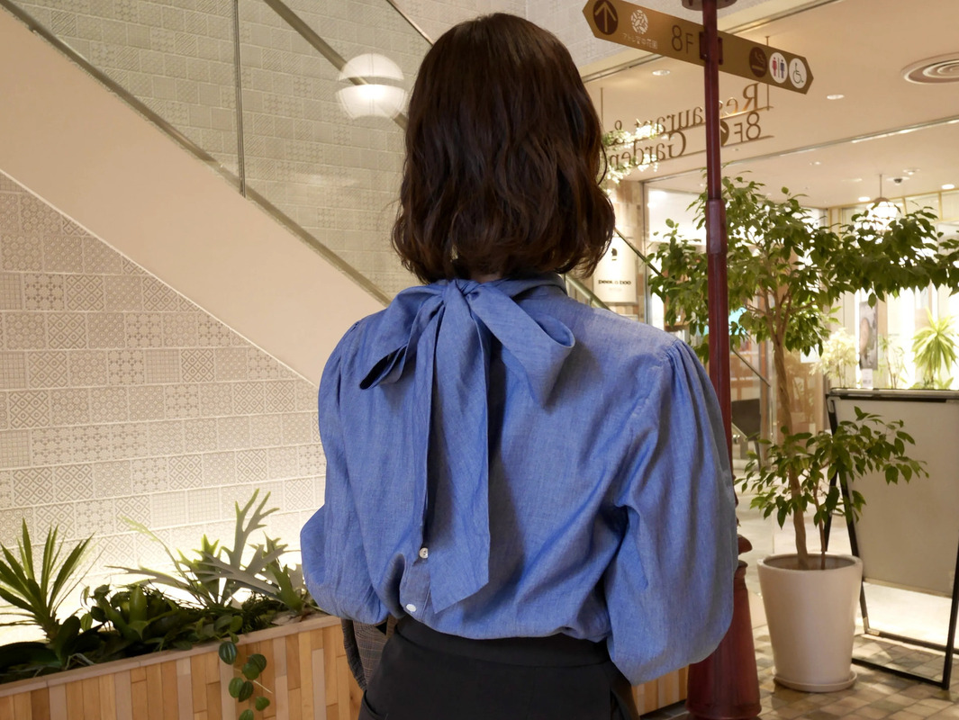 爽やかなブルーとクリーンな白のボウタイブラウス