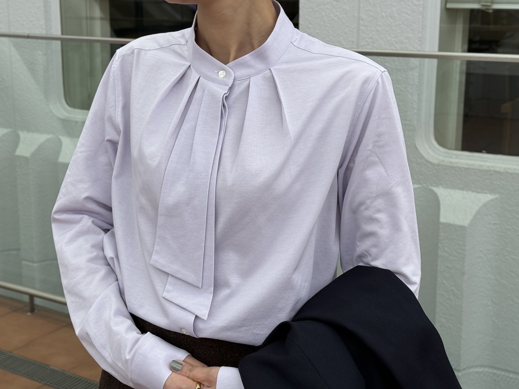 ラベンダーカラーを取り入れることで、顔まわりが明るく、春らしさを感じられるので、おすすめです。