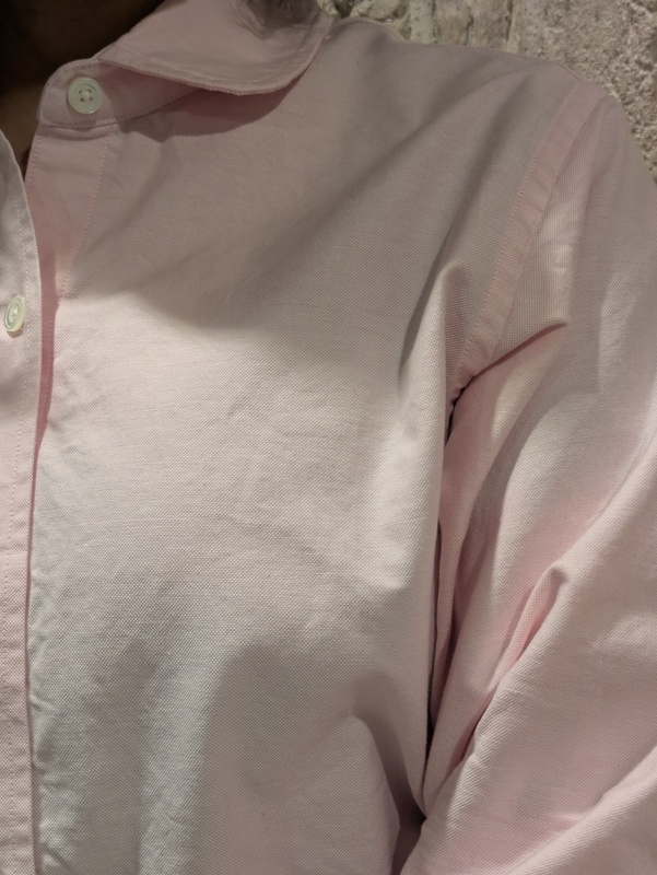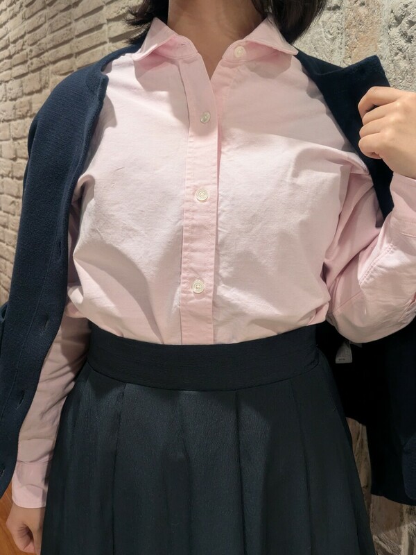 鮮やかな桜色が目を引くシャツです。