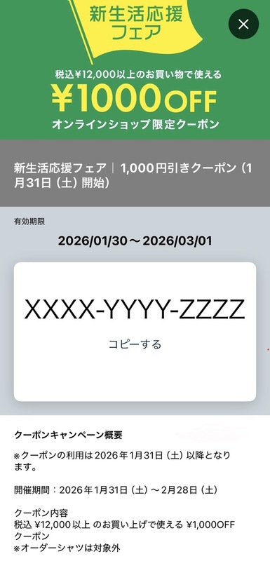 新生活応援フェアのクーポンを選択し、「使う」を押し、記載されている英数字のクーポンコードを確認します。 「コピーする」ボタンをタップすると、入力の手間が省けて間違いにくくなります!
