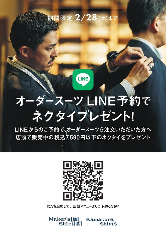 2026年2月1日~2月28日の期間内にLINEからオーダースーツをご予約いただいたお客様に、税抜き¥6,900以下のネクタイをプレゼントいたします。